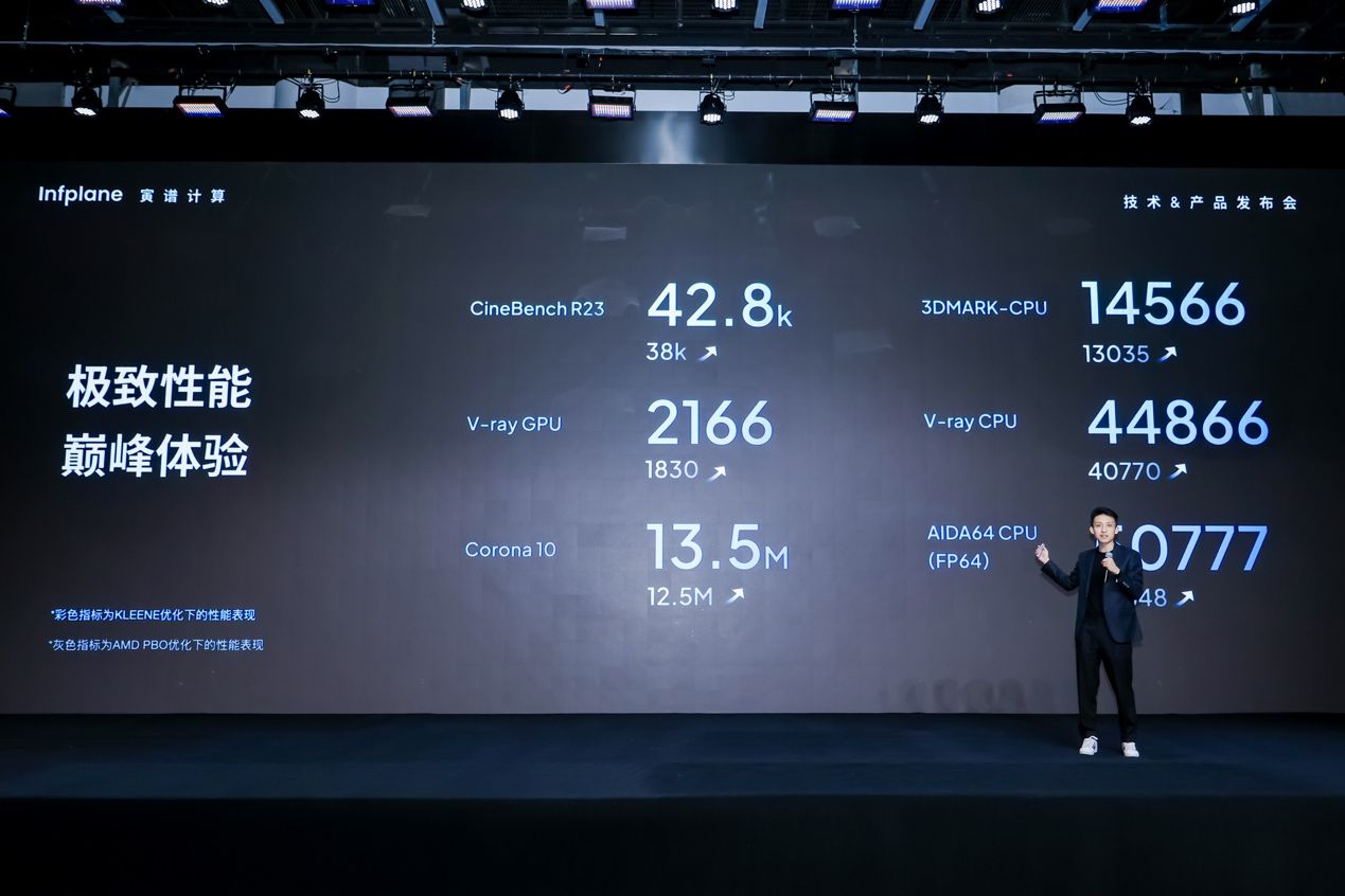 在发布会现场,Hilbert 以 KLEENE 主板智控系统生成的策略运行多项主流基准测试,展示了KLEENE系统级协同下的综合性能表现(测试结果受具体配置、软件版本与测试环境影响,数据仅供参考):CineBench R23 42.8k、3DMark-CPU 14566、V-Ray GPU 2166、V-Ray CPU 44866、Corona 10 13.5M、AIDA64 CPU(FP64)50777。寅谱计算表示,上述成绩旨在反映 Hilbert 在 CPU/GPU 计算、渲染与双精度等典型负载下的综合能力;相较于处理器芯片的纸面参数指标,KLEENE 更关注在真实工作流中对整机实际性能和功耗的实时优化,让“桌面级超算”的体验可被长期和可靠地使用。