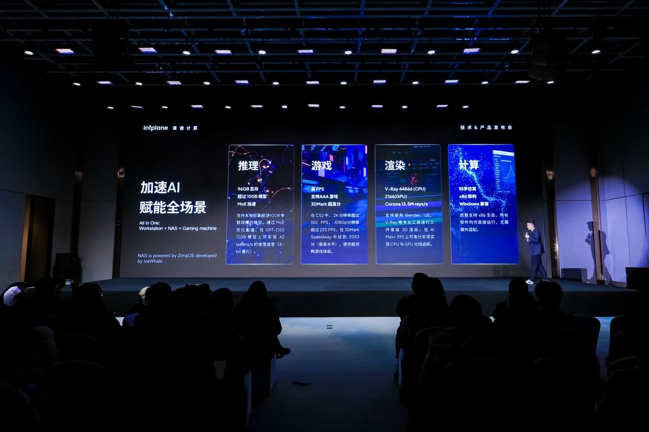 发布会同期,寅谱计算推出其“桌面超算”系列的首款产品 Infplane Personal Workstation:Hilbert(以下简称“Hilbert”)。该产品系寅谱与AMD、aoni、abee等多家生态合作企业共同完成,旨在在体积、成本与功耗约束下,将原本集中于服务器或集群的计算能力下沉至个人桌面环境,为本地大模型推理、科学计算与生成式 AI 工作流提供更稳定的端侧算力底座,提供作为高性能游戏主机的能力,并同时支持 NAS 功能,由 zimaOS 提供系统支持。该产品将于2026年于北美市场上线,并为寅谱计算预计于2026年7月发布的基于AMD平台的二代产品进行市场预热。据悉,该系列的第二代产品将整合工作站、NAS、网关和游戏主机的综合能力。