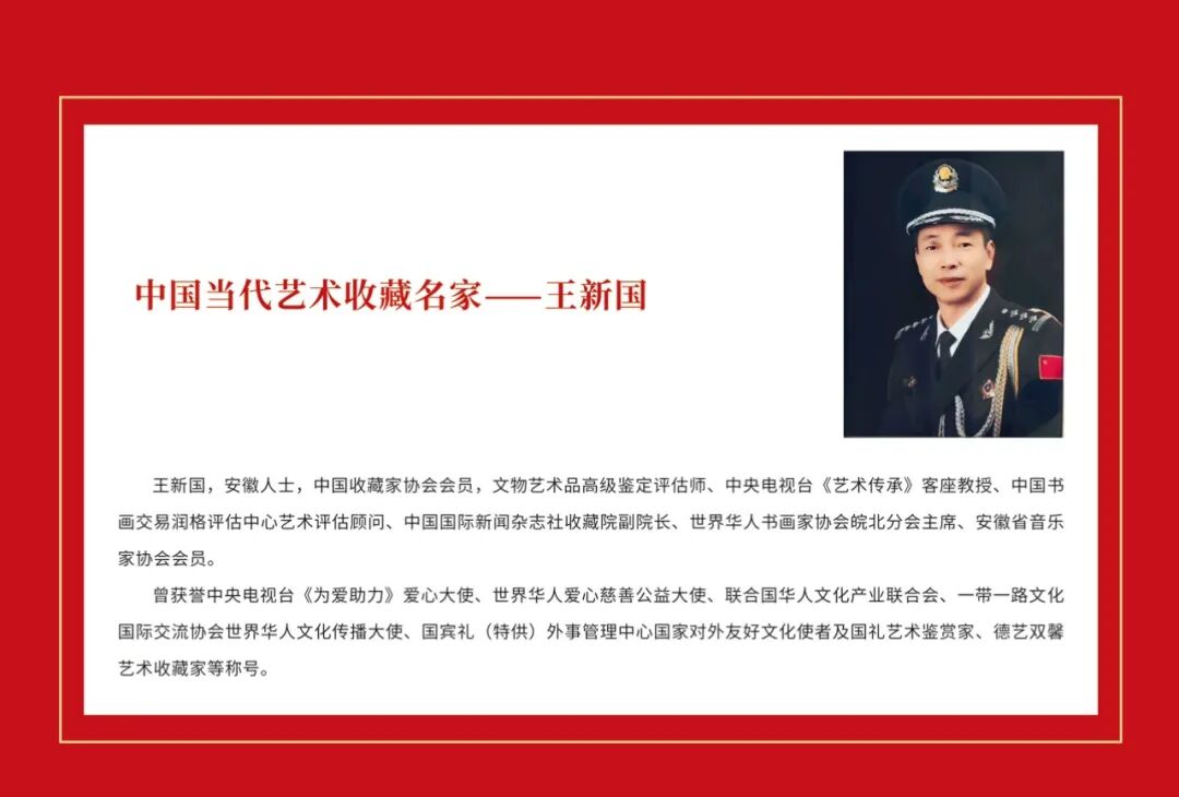 王新国,安徽人士,中国收藏家协会会员,文物艺术品高级鉴定评估师、中央电视台《艺术传承》客座教授、中国书画交易润格评估中心艺术评估顾问、中国国际新闻杂志社收藏院副院长、世界华人书画家协会皖北分会主席、安徽省音乐家协会会员。