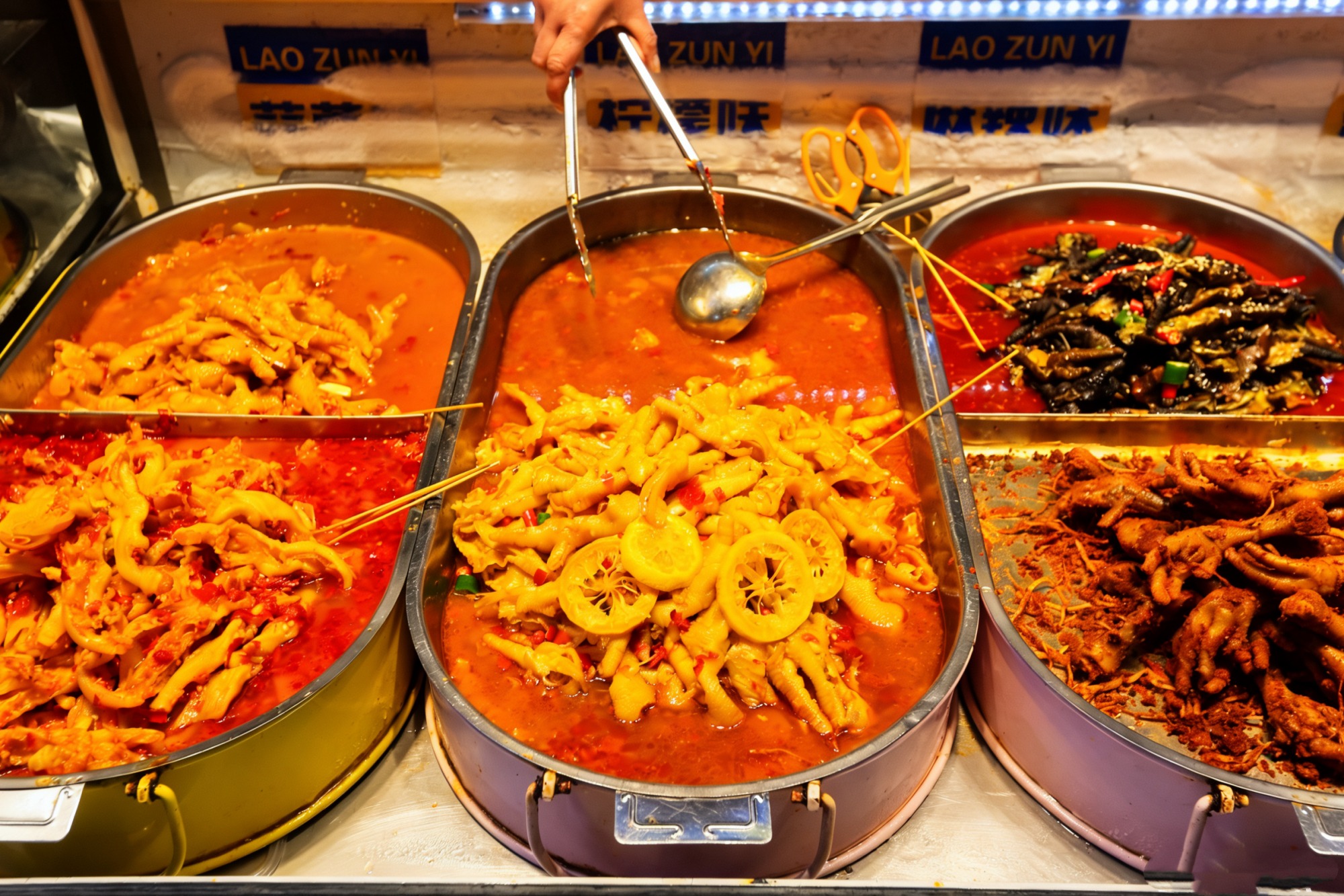 卤味摊是捞沙巷的必打卡美食地,柠檬酸辣无骨凤爪、红油蒜香鸡爪、麻辣卤味等一应俱全,凤爪在汤汁里浸泡得入味十足,酸辣开胃,是逛吃路上的美食好搭子。