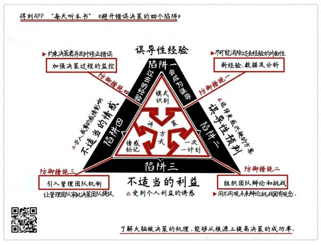知道了让自己犯错的四个陷阱,那在做决策的时候,主动给自己亮出警示红旗,问问自己是不是受到以前经验的影响了?是不是我其实已经有了先入为主的答案了?我是不是受到自己感情因素影响了?是不是我的决定其实更多是在考虑自己个人利益呢?