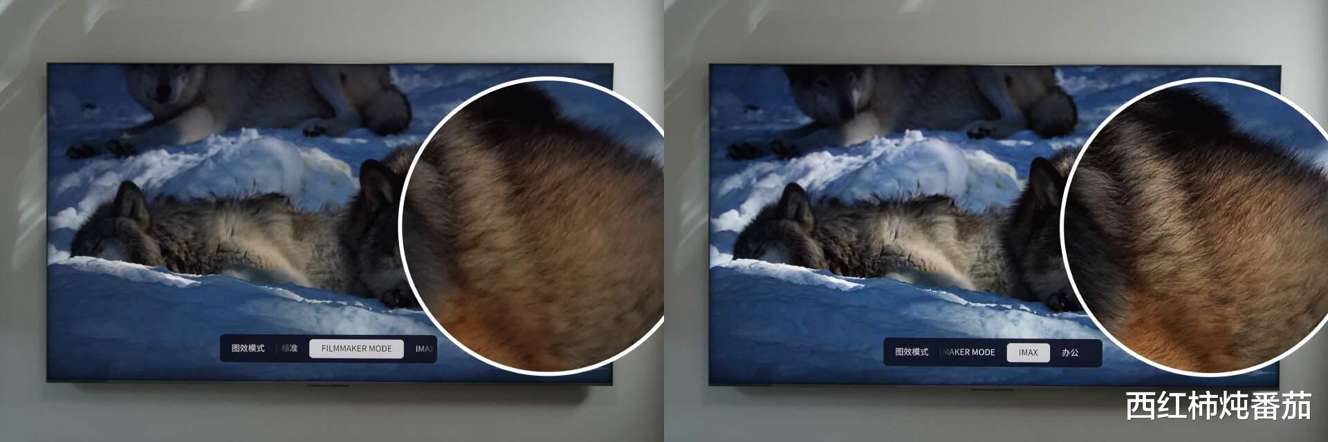 至于 IMAX模式则在最大程度尊重原画的基础上,将画面细节进行了锐化,比如可以看到右边那只狼的身体部分毛发细节比FILMMAKER MODE好了很多 ▲