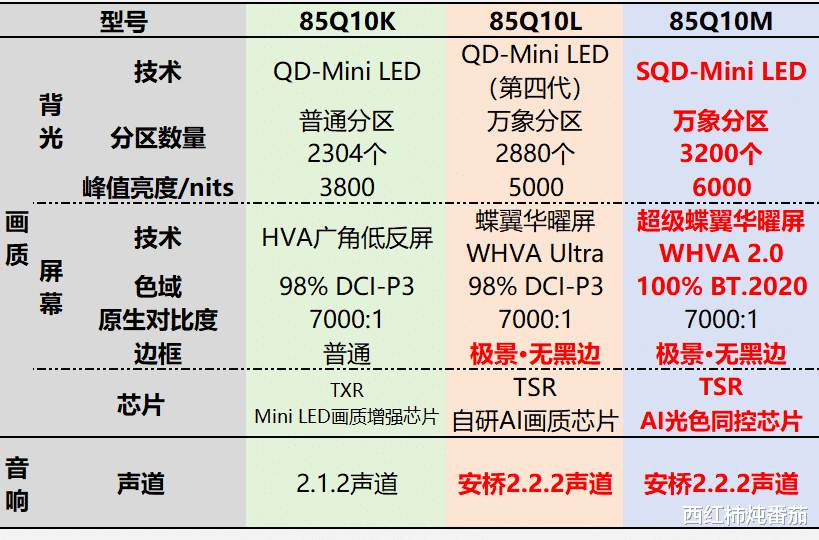 为了让大家更直观地了解这款 TCL 85Q10M到底升级了什么,我把TCL Q10系列最近的三代产品参数放在一起做个对比: