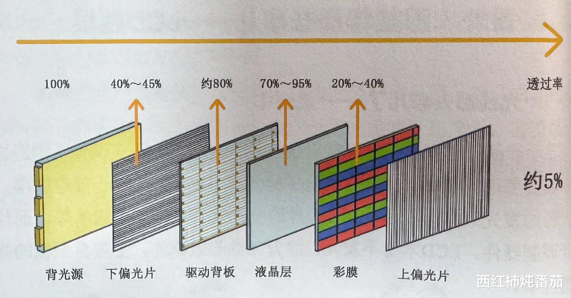 LCD液晶电视在成像过程中需要让背光先后通过下偏光片、驱动背板、液晶屏、彩色膜以及上偏光片。但在这个过程中,仅有约 5%的背光能够顺利透过上述结构,剩下的 95%被各种结构以「过路费」的形式给消耗掉了——这也是液晶电视一直被诟病峰值亮度低的根本原因 ▲