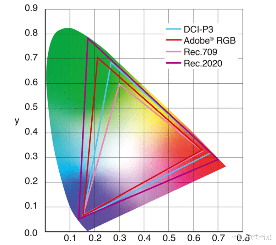 说一组最直观的数据让大家感受一下这种差距:在 CIE 1931色度图中,BT.2020的色域面积比 DCI-P3大了整整 40%-50%——即便按照最低的 40%计算,100% BT.2020的色域面积也比 98% DCI-P3大了整整 (1.4-1*0.98)/(1*0.98)≈42.9%;如果按照最高的 50%计算,这个差距将达到惊人的53.1%,高出整整一半。