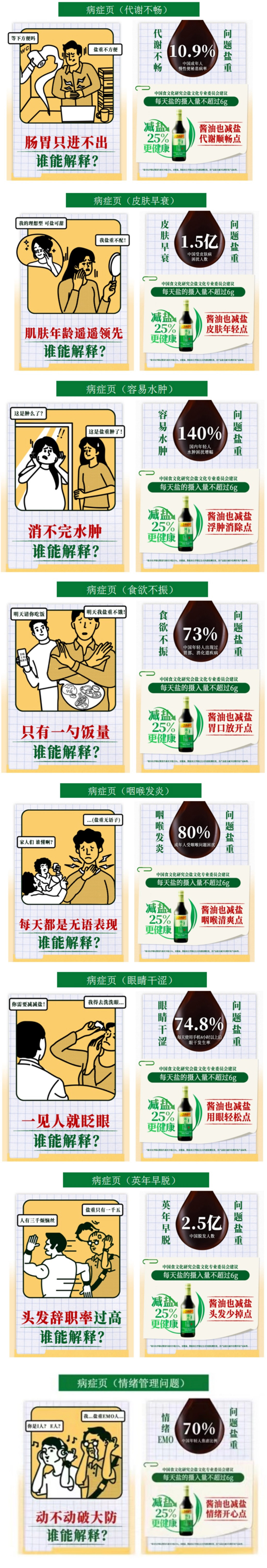 本次中国食文化研究会盐文化专业委员会携手李锦记联合发布的减盐倡议书中,通过当代年轻人更易于接受的插画风格,呈现了八大因过量食盐导致的身体病症,包括:脱发、代谢排便不畅、水肿、皮肤干燥衰老、咽干、咽喉发炎、情绪低落、肠胃动力弱问题,提出了选用减盐酱油的重要性。