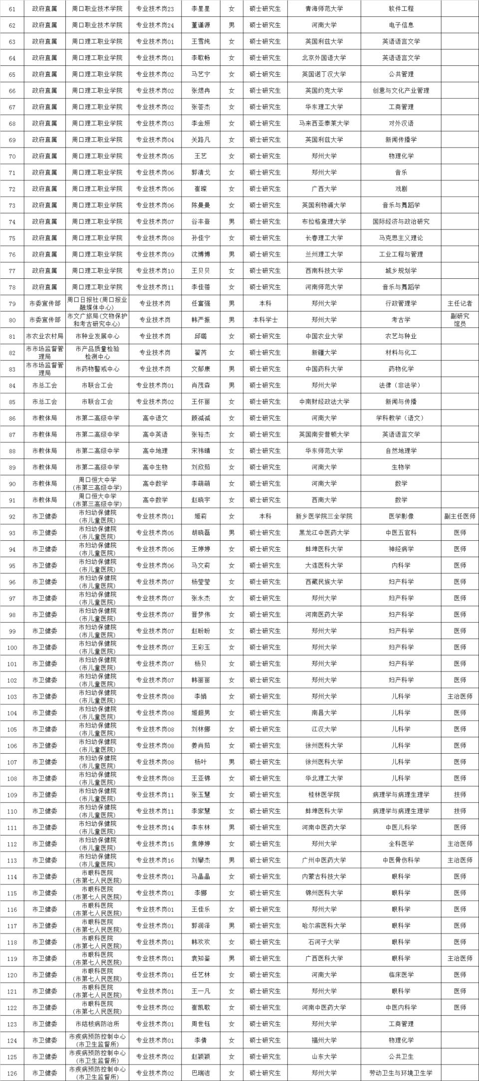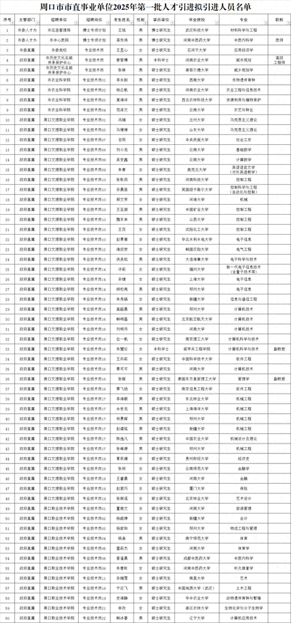 根据《周口市事业单位2025年第一批人才引进公告》等有关要求,周口市市直事业单位2025年第一批人才引进工作通过报名、资格审查、笔试、面试、体检、考察等程序,确定王旭等126名同志为拟引进对象(具体名单见附件),现予以公示。公示时间为2025年10月28日至2025年11月3日。