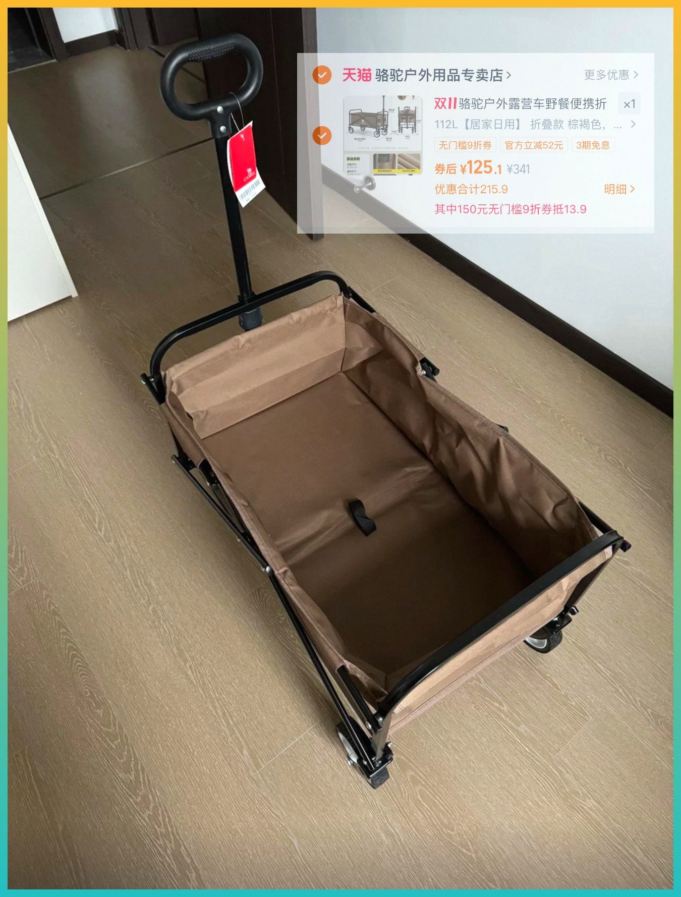还有户外神器——可折叠手推车。露营、野餐、带娃出门必备,收纳起来不占地方,设计感也很能打,一辆300r出头,简直不要太香!