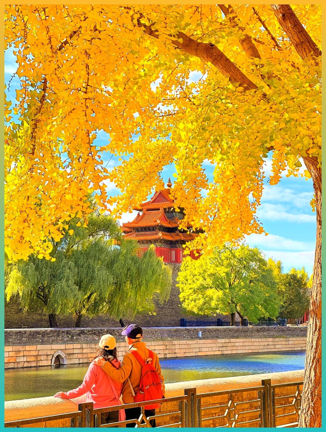 你见过故宫角楼下的金黄银杏吗?阳光一洒,整个世界都是温柔的滤镜。情侣们并肩走过,连护城河都倒映着一丝丝不舍的暖意——