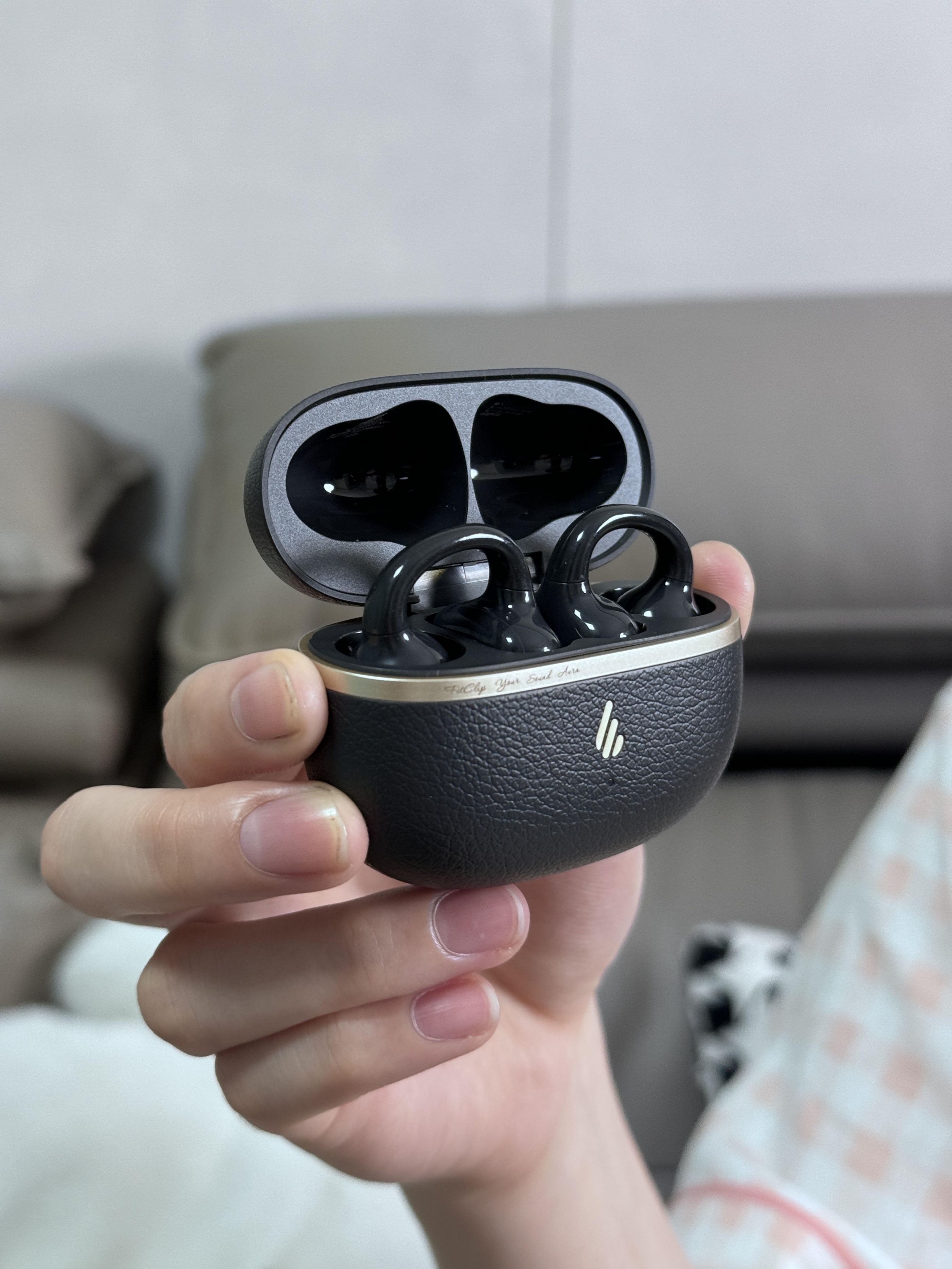 先说说最让我惊喜的佩戴感!它不是那种要塞进耳朵的设计,用的是漫步者专利的多曲率人体工学造型,加上0.5mm的柔韧镍钛合金丝,单耳才5.4g重,跟没戴东西似的。表面还有亲肤涂层,贴在耳朵上滑滑的不闷汗。我试过戴它通勤2小时,或者健身房跳操,耳朵完全不疼,狂甩头也没掉过,运动党真的可以冲。