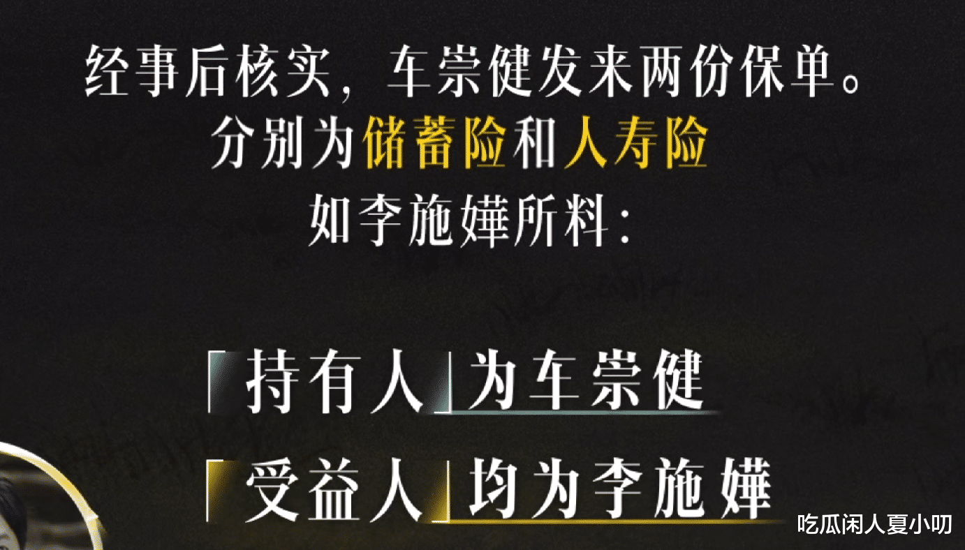车崇健确实买了两份保险,分别是储蓄险和人寿险,持有人是车崇健,受益人是李施嬅。