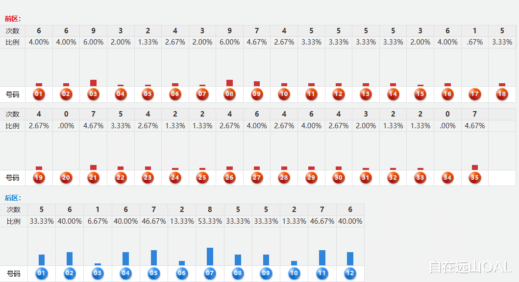 3. 后区小小组合反弹:后区01+04的和值5,打破了近10期13-18的和值区间惯例。结合跨度3-8占主流的特点,下期后区更可能转向中号组合。