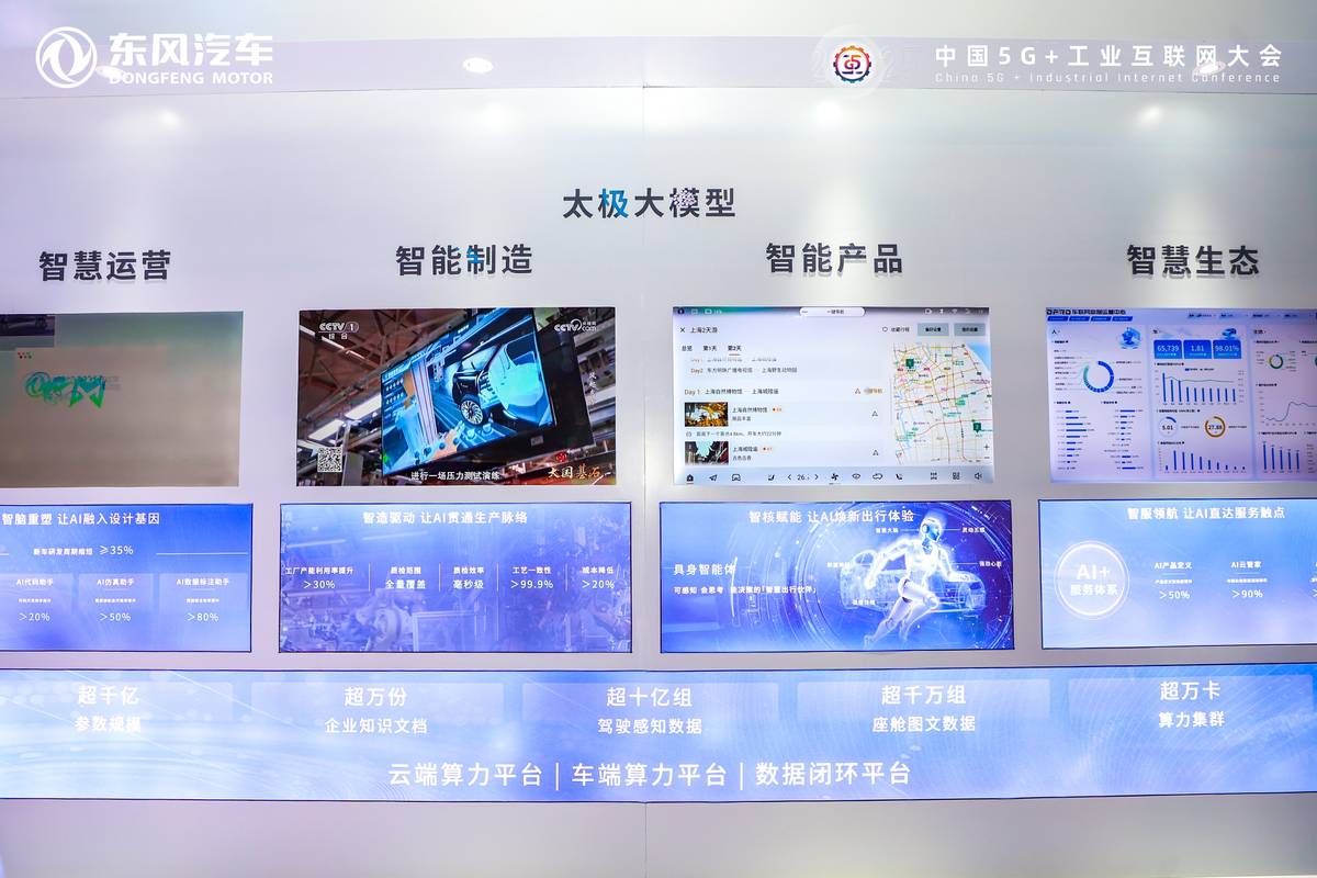 以拥有超千亿参数规模的“太极大模型”为核心,东风汽车构建了企业级AI能力底座。该大模型基于自主可控的AI技术体系全栈自研,具备全域融合、全场景赋能和持续自主进化三大特征,全面赋能智能产品、智慧运营、智能制造、智慧生态等全流程场景。这标志着东风汽车正从传统的汽车制造商,向拥有AI原生能力的科技企业转型。