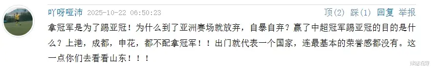 有球迷怒斥:“拿冠军是为了踢亚冠!为什么到了亚洲赛场就放弃,自暴自弃?赢了中超冠军踢亚冠的目的是什么?海港、成都、申花,都不配拿冠军!出门就代表一个国家,连最基本的荣誉感都没有。”