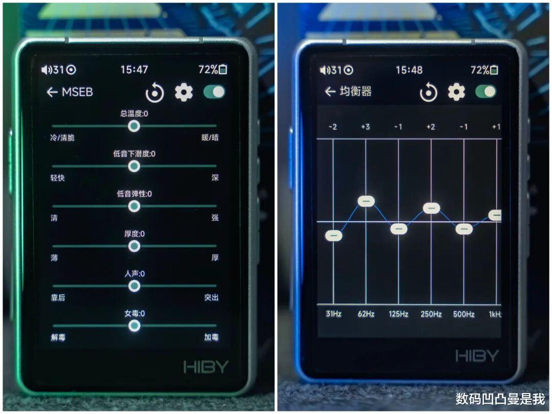 总体上三频均衡,既保留了足够的音乐性,让声音带着自然的温暖,又保持了足够的准确性,让细节得以完整呈现。播放器还内置了HiBy自研数字调音台MSEB,可直接从声音冷暖、厚度、人声前后、乐器瞬态等直观听感角度进行调节,打造专属个人的音色档案。