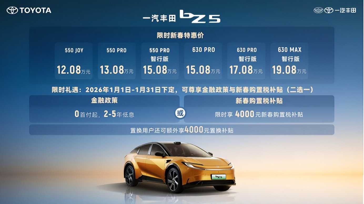 2025年12月31日,一汽丰田举办智电bZ双车焕新发布会;公布bZ3智享家 JOY版和bZ3智享家 PRO版限时焕新价分别为9.38万元和10.38万元。同时,在2026年1月1日-1月31日期间下定的用户,限时额外享4000元新春购置税补贴,或者包括0首付,2~5年低息;贷款5年,前两年0首付0息,后3年低息的“5免2”等在内的金融政策福利。
