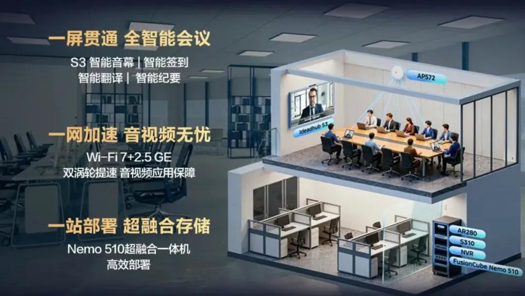 一屏贯通,Ideahub S3全新登场,实现全智能会议;一网加速,Wi-Fi 7+2.5GE双涡轮提速,音视频会议无忧;一站部署,FusionCube Nemo 510持续热销。其中2.5GE+Wi-Fi 7端到端高性能组网方案保障会议室等高密场景并发接入及音视频应用识别与加速需求,实现120路视频不卡顿,为中小型企业带来极速办公体验。
