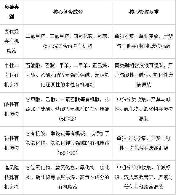 源头分类是有机废液安全管控的第一道防线,也是决定后续全流程管控有效性的核心环节。分类的核心准则为 “相似相溶、性质相容、风险同级”,需严格按照化学性质与风险等级精准分类,严禁跨类别混装。