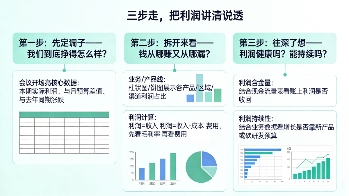 我自己开了上百场经营分析会,说实话,我最怕看到的场面,不是数据有多难,而是负责人上去把利润表从头念到尾:收入多少,成本多少,费用多少,最后利润多少,念完就坐下。