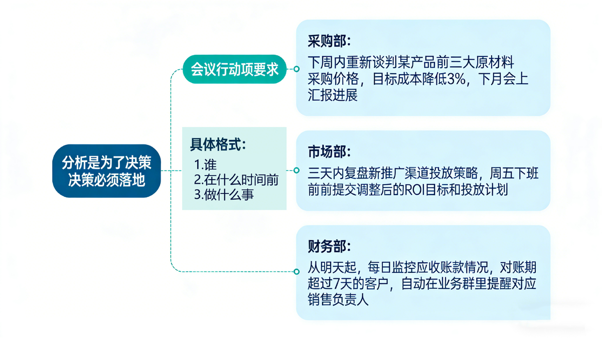 前面三步走完,算是把利润“讲清楚”了。但会议的目的达到了吗?没有。我一直强调,分析是为了决策,决策必须落地。所以,会议最后,一定要针对刚才分析出的问题,形成清清楚楚的行动项。