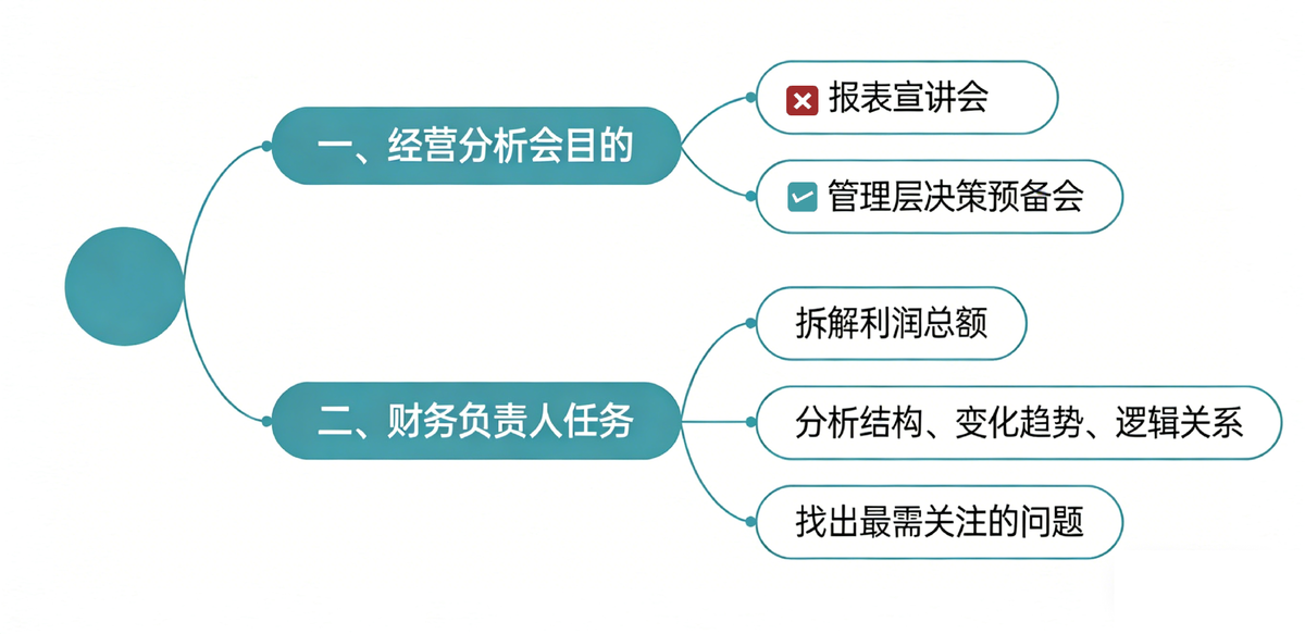 这十多年财务总监做下来,我一直和团队强调一个观点:经营分析会,不是报表宣讲会,它是公司管理层的决策预备会。利润表摆在这里,目的不是告诉老板上个月赚了多少钱,而是帮管理层看清:我们的经营到底在哪儿出了问题?风险可能藏在哪儿?接下来的策略要不要调、怎么调?