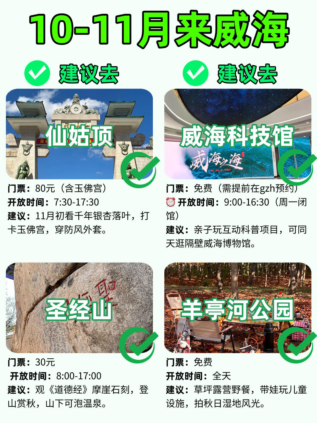 10-11月威海秋高气爽,平均气温15-20℃,偶尔有台风尾劲但影响小,人少景美超适合暴走!