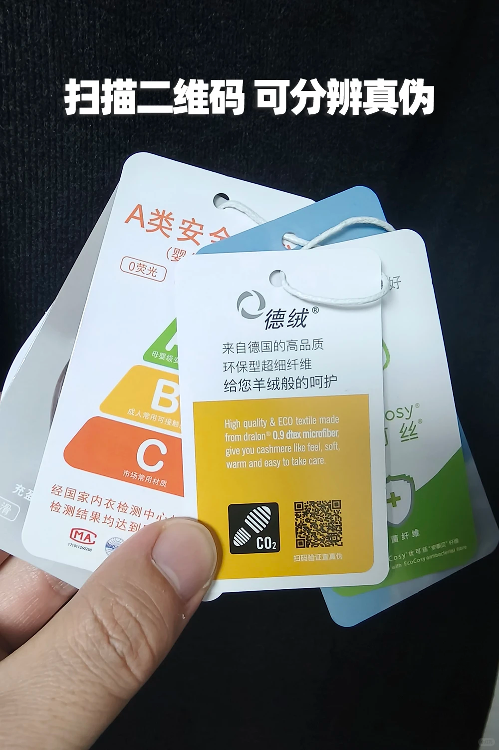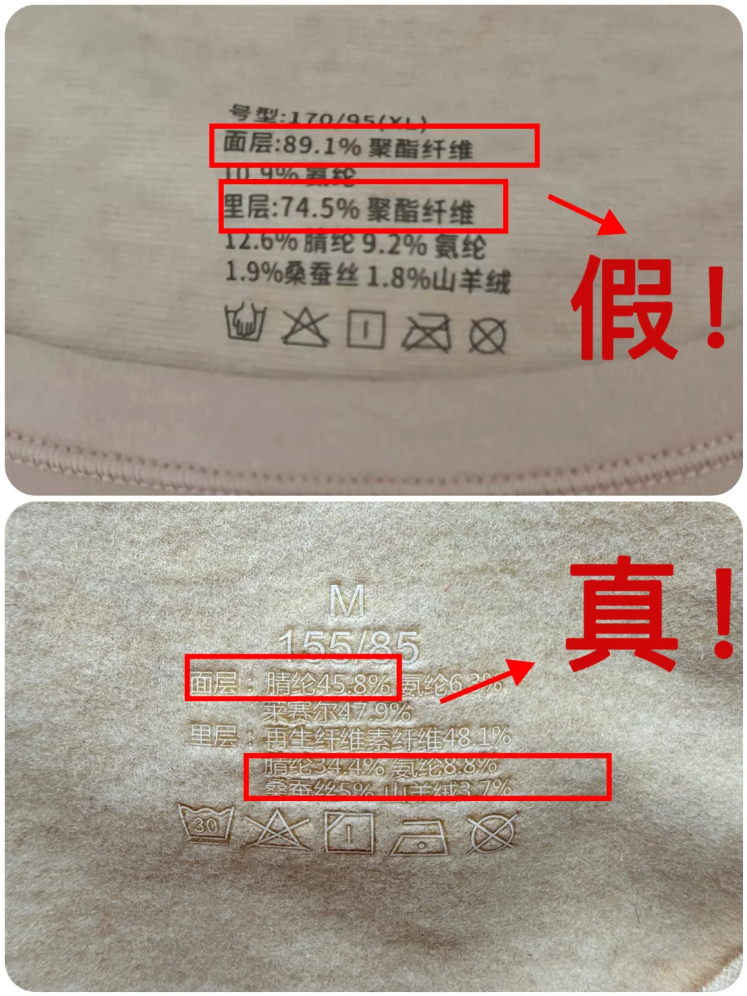 所以我们在买德绒内衣的时候就要学会看标签,第1个是腈纶或者聚丙烯腈纤维,这才是真的德绒。