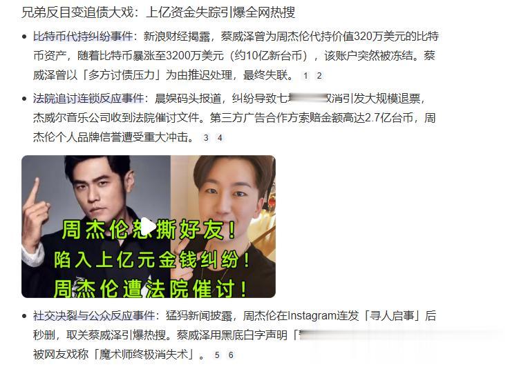周杰伦公开发表:“再不出现你就完了。”已死魔术师蔡威则代持周杰伦的比特币。然后突然消失。演唱会质量低迷:周杰伦演唱会在网上纷纷吐槽,小弟太多,而演唱表现不如曾经。刘畊宏此前餐厅风波。周杰伦的MV常常使用自身兄弟出演,同时自己也帮助杨代瑞等人发行专辑,自己出场。但是整体的音乐质量严重不足,拉低了他的音乐口碑。人多有人多的好处,但是每一个人也都这有风波的隐患。但是当目前为止——周杰伦的爱兄弟人设,也因为兄弟们的专业能力不足导致了一定的争议。
