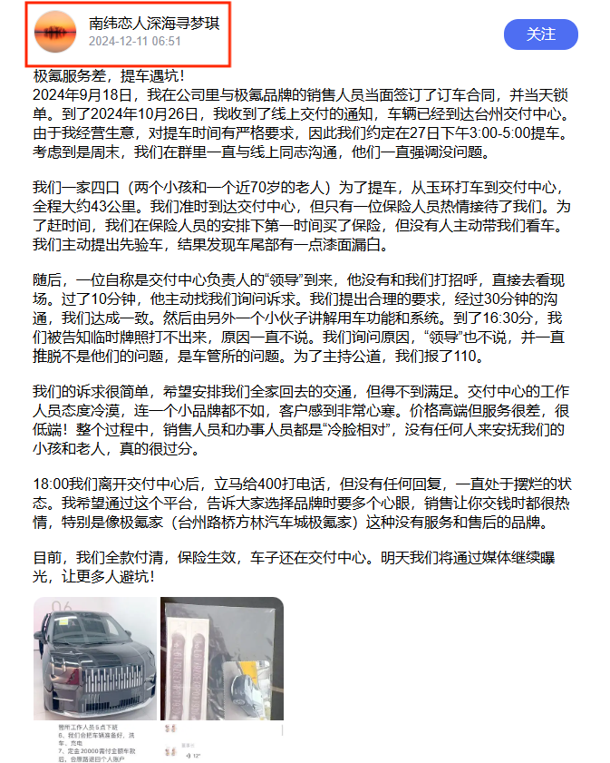 第三博主称销售人员“没有”安抚老人小孩,我自己就是极氪007车主,老实说基本上别家有的服务极氪都不会吝啬,即便是态度不好的也是个人行为,借机拉踩所有极氪销售着实也说不过去
