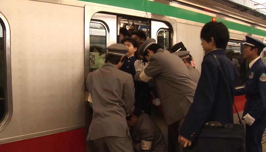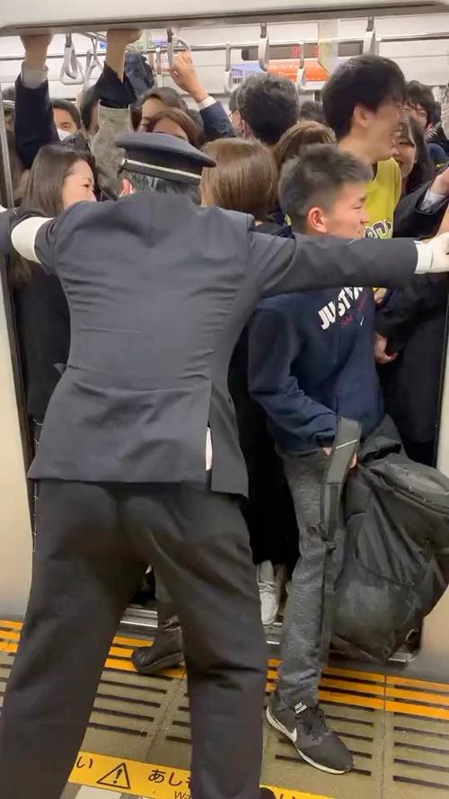 日本的地铁几乎已经成沙丁鱼罐头,人已经不能叫做人了。地铁里的工作人员在上下班高峰期间也担任专业推手,在外面把他们使劲往里塞,确保他们都挤上去。