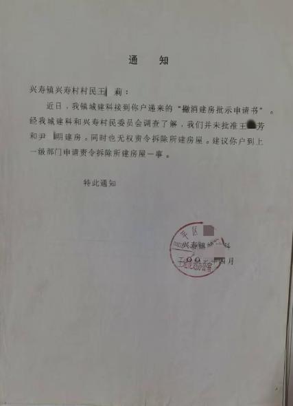 经查,王某芳及其丈夫在兴寿村已拥有两处宅基地及住房,均持有合法土地使用证明,其家庭五口人具备充分居住条件,并非无房居住的情况。王某莉发现上述违建行为后,先后向兴寿镇城建及土地管理部门反映情况。兴寿镇城建部门虽出具过相关通知,但问题并未得到实质性解决;部分土地管理部门工作人员却以“房屋系父母遗产”为由,对该违建行为予以认可,而这一认定与宅基地使用权登记在王某莉名下的客观事实相悖。