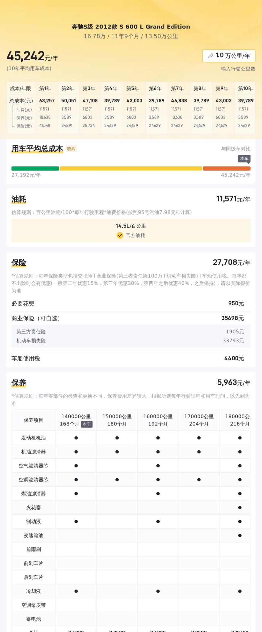 尽管油耗高、保养贵,但这辆S600L Grand Edition的保值率却远超同级车平均水平,达到了惊人的48.97%。这体现了S级轿车的市场认可度和品牌价值。即使你将来再次转手,也能够获得较高的回报,这在一定程度上抵消了高昂的用车成本。