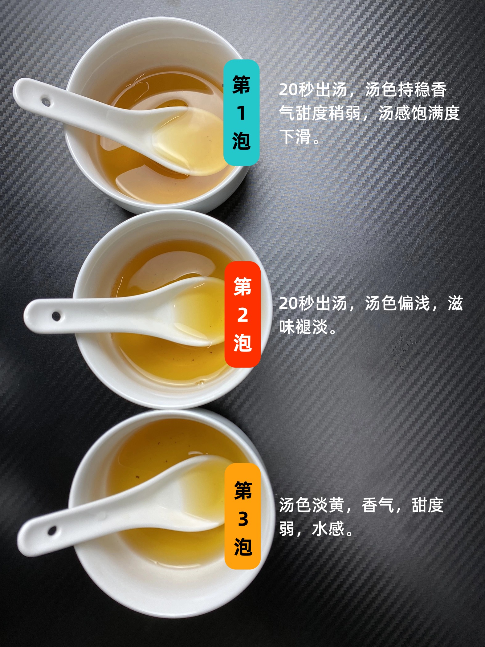 第一泡,不洗直出,汤色金黄油亮,果香,蔗糖甜清爽,口感柔滑,细腻。舌底鲜爽舒服。