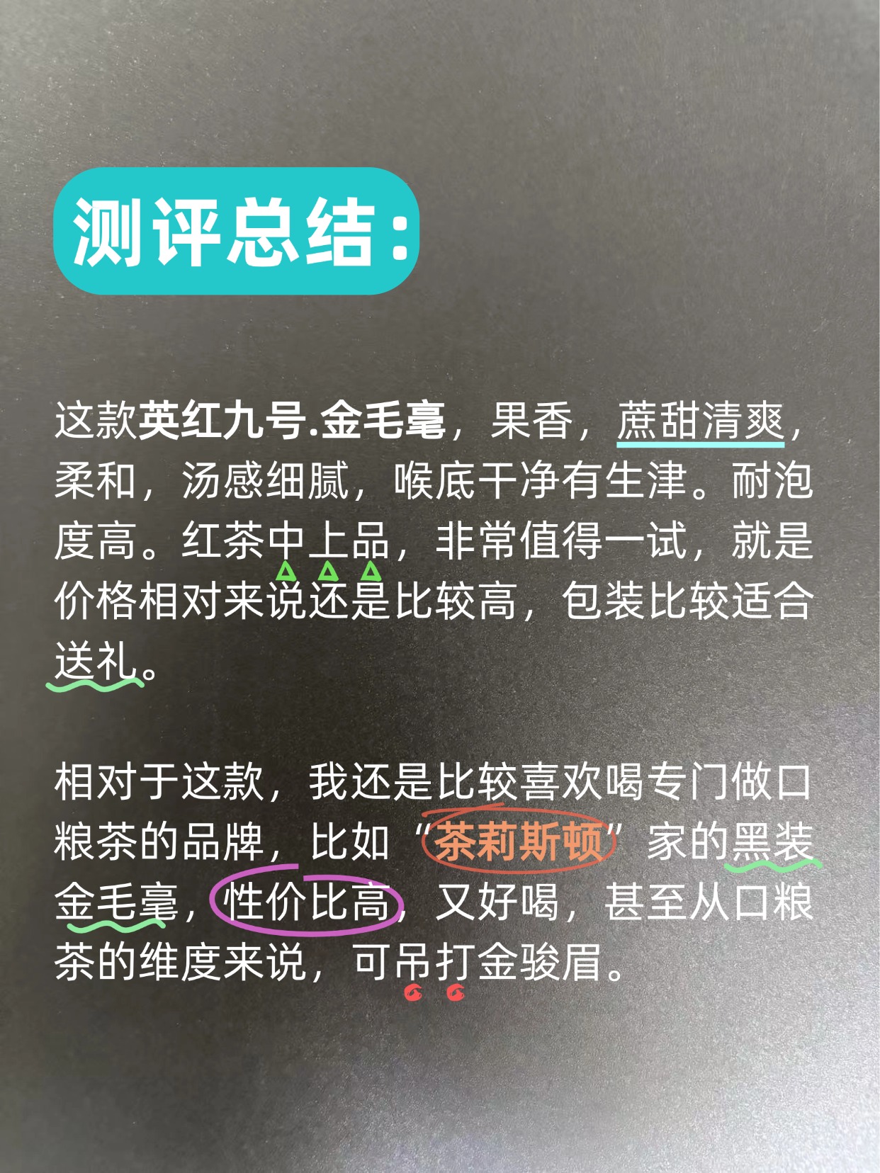 相对于这款,我还是比较喜欢喝专门做口粮茶的品牌,比如“茶莉斯顿”家的黑装金毛毫,性价比高,又好喝,甚至从口粮茶的维度来说,可吊打金骏眉。