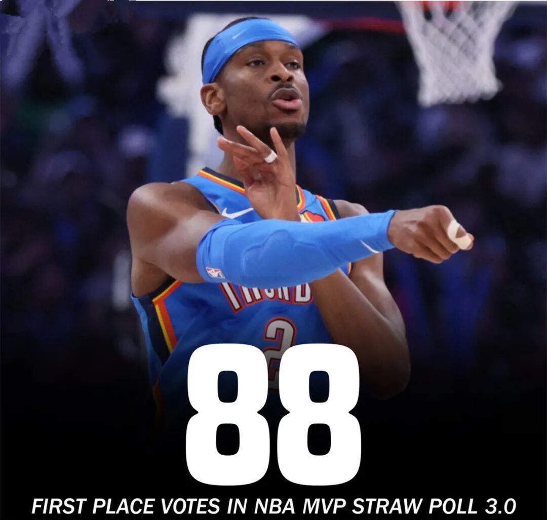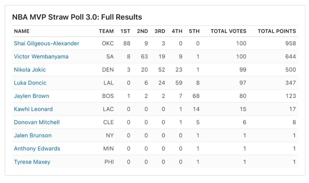 事情是这样,昨天深夜,ESPN公布了本赛季第三次MVP模拟投票结果,亚历山大以88张第一选票、总得分958分断档排在第一,紧随其后的分别是文班亚马、约基奇、东契奇、杰伦布朗。