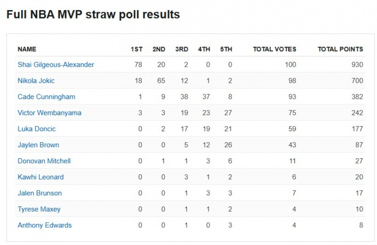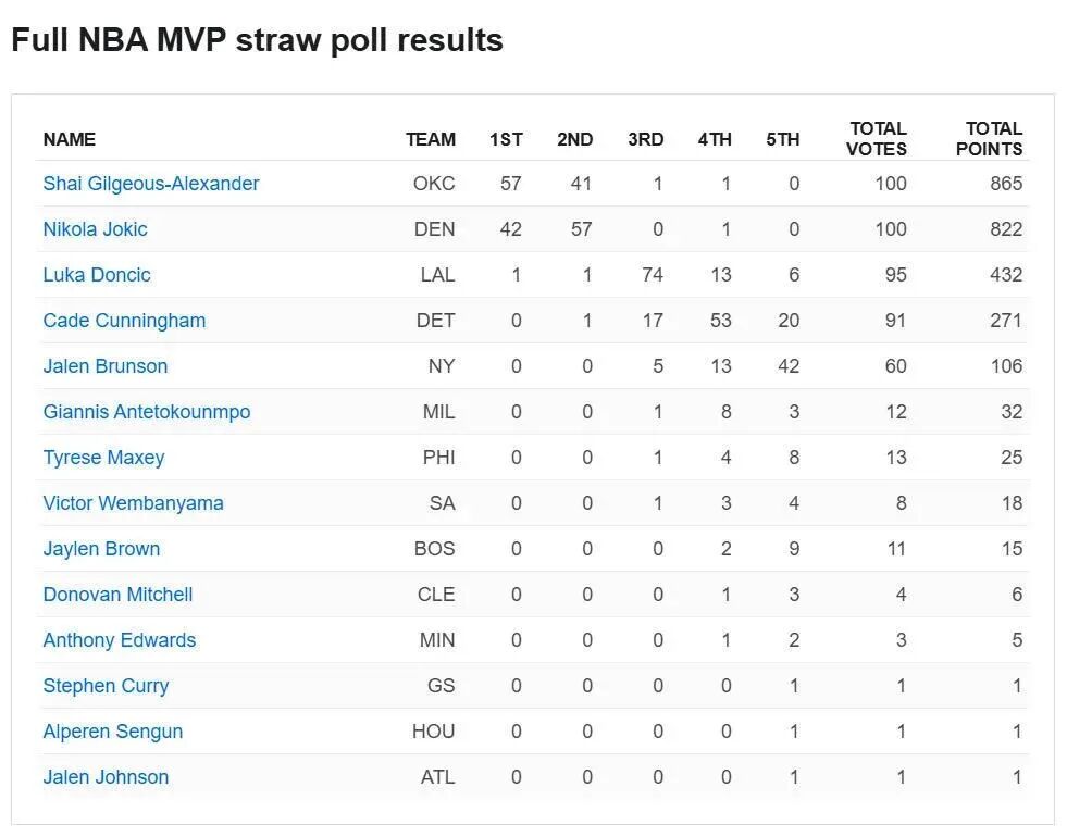 其中上赛季,ESPN最后一次模拟结果:亚历山大77票,约基奇23票。最终的真实结果则是:亚历山大71票,约基奇29票,非常接近。