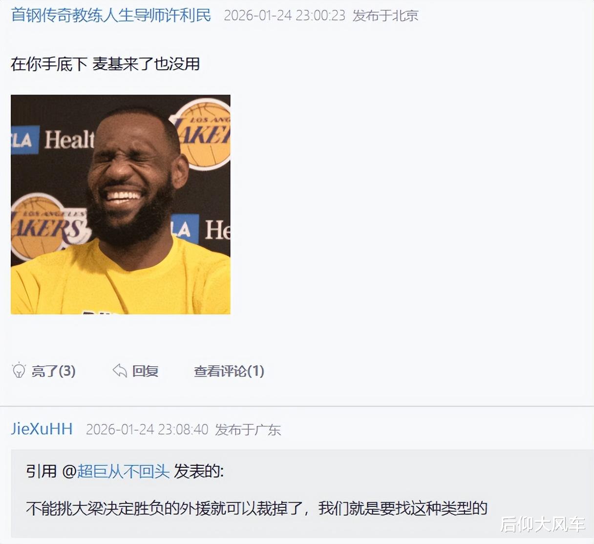 由此看来,短期内北京队不会再去寻觅新的外援,只能暂且忍受现状。但问题是,北京队真的有足够的时间去等待贝利找回状态吗?赛后有北京球迷反问许利民:先不说贝利水不水,你能制定什么战术?不能挑大梁的决定胜负的外援就可以裁掉了,我们就是要找这种类型的。更有球迷直接嘲讽许利民:在你手底下,麦基来了也没用。