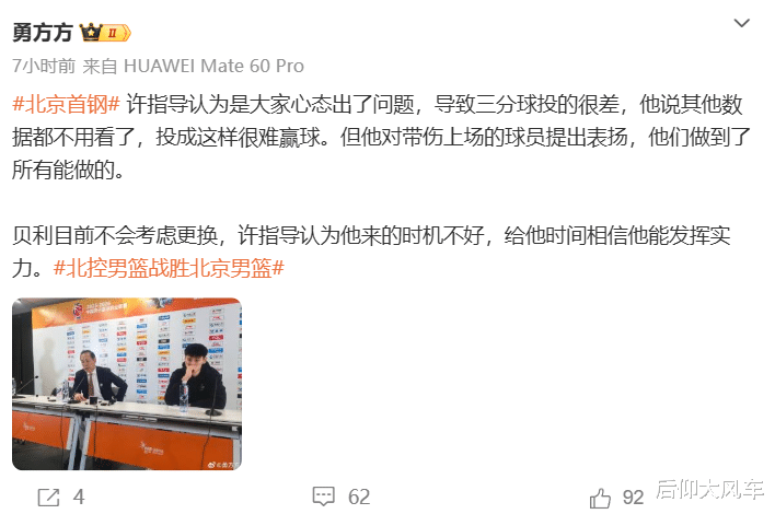 许指导点出了球队三分球不准的问题,确实,这一场北京队确实投得铁,但话说回来,难道北控的三分就很好吗?14投5中的三分,也不见得很好吧,说到底,这一场北京主要还是内线被打爆了,篮板球虽然只输了4个,但北京让邹雨宸在内线8中5,罚球11中11砍下了21分15篮板,限制不住邹雨宸,加上贝利完全没有表现,还是打不出身价,才是这一场比赛北京输球的关键原因。