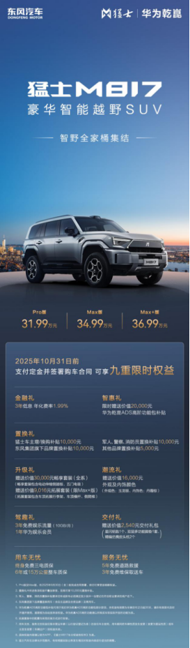 全长续航关键拼图,智能越野体验再升级!9月29日,东风猛士科技与华为联手打造的豪华智能越野SUV猛士M817长续航新成员——猛士M817 Max+版正式上市,官方指导价36.99万元,10月31日前支付定金并签署购车合同,可享九重限时权益,轻松开启全域智野新体验。