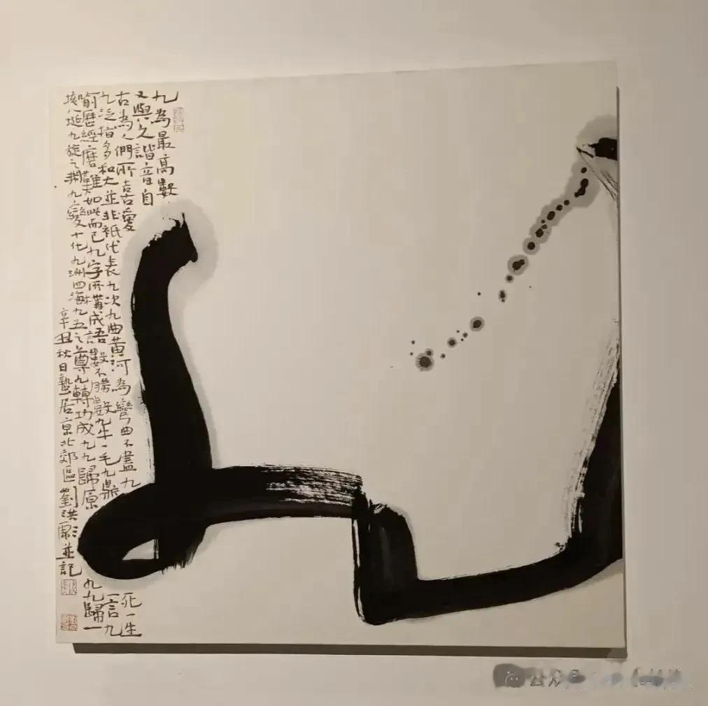这个“九”字,造型奇崛,落笔如灵蛇探头,收笔如神龙摆尾,十分新颖独特,行笔中,圆转兼具刷笔,把婉约与果断融合于一体。