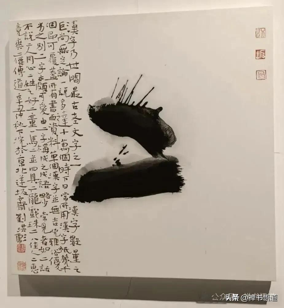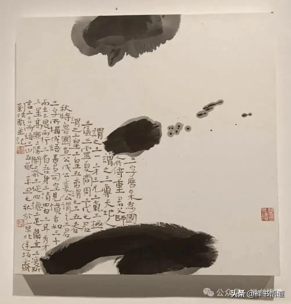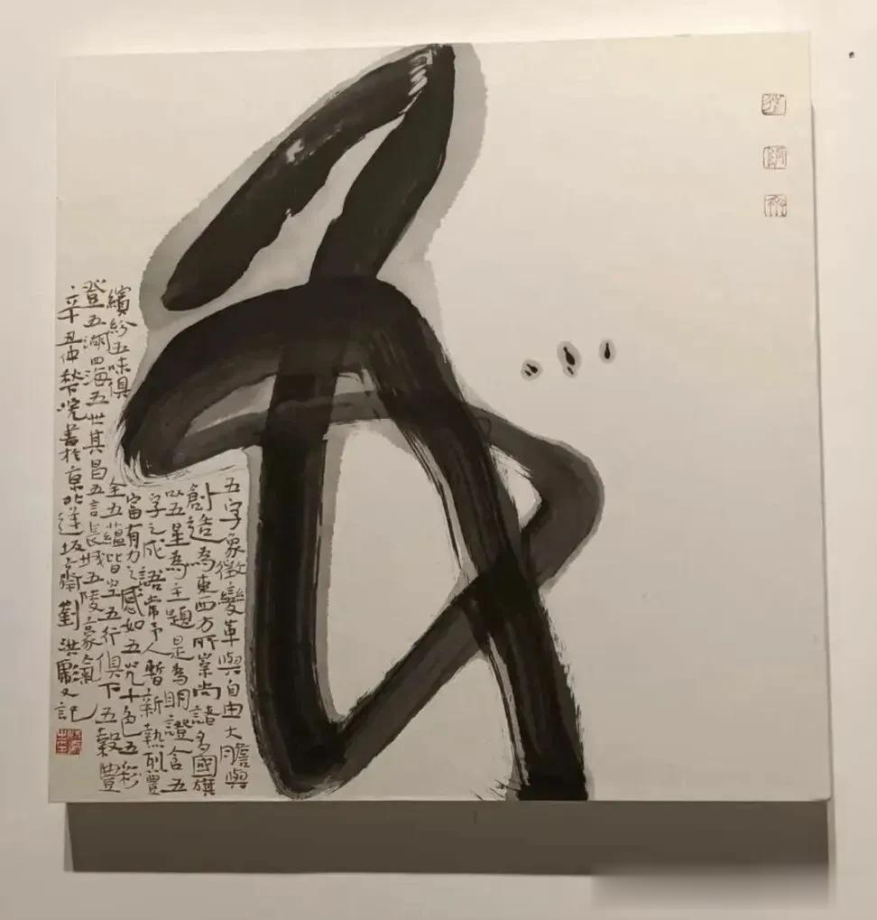 这个“一”字用渗墨法,内里饱满结实,崛曲蜿蜒,上面朦朦胧胧渲染一层淡墨,如云横长天,笼盖四野,配合下面的小字,构成了一幅绝妙的山水画图。