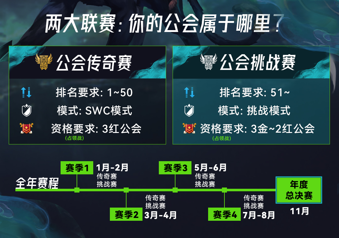 比赛模式上,公会传奇联赛将采用SWC模式,公会挑战联赛则使用挑战模式。全年赛事共设四个赛季及一次年度总决赛,每个赛季由8支公会参与,采用淘汰制进行。每赛季的冠亚军公会将直接晋级年度总决赛,其余被淘汰的公会需重新申请下一赛季席位。