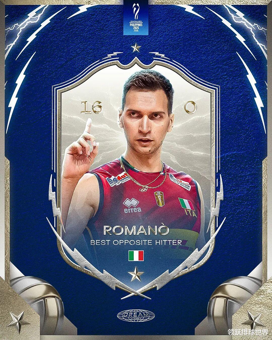 现年27岁的尤里·罗马诺,过去两年在国家队的表现堪称稳定高效。他在2022年就随队获得世界冠军,也是欧洲冠军,2025年再度称王世界之巅,本届世锦赛中,他凭借强势发挥入选了赛事最佳阵容,是意大利男排新一代的中流砥柱。