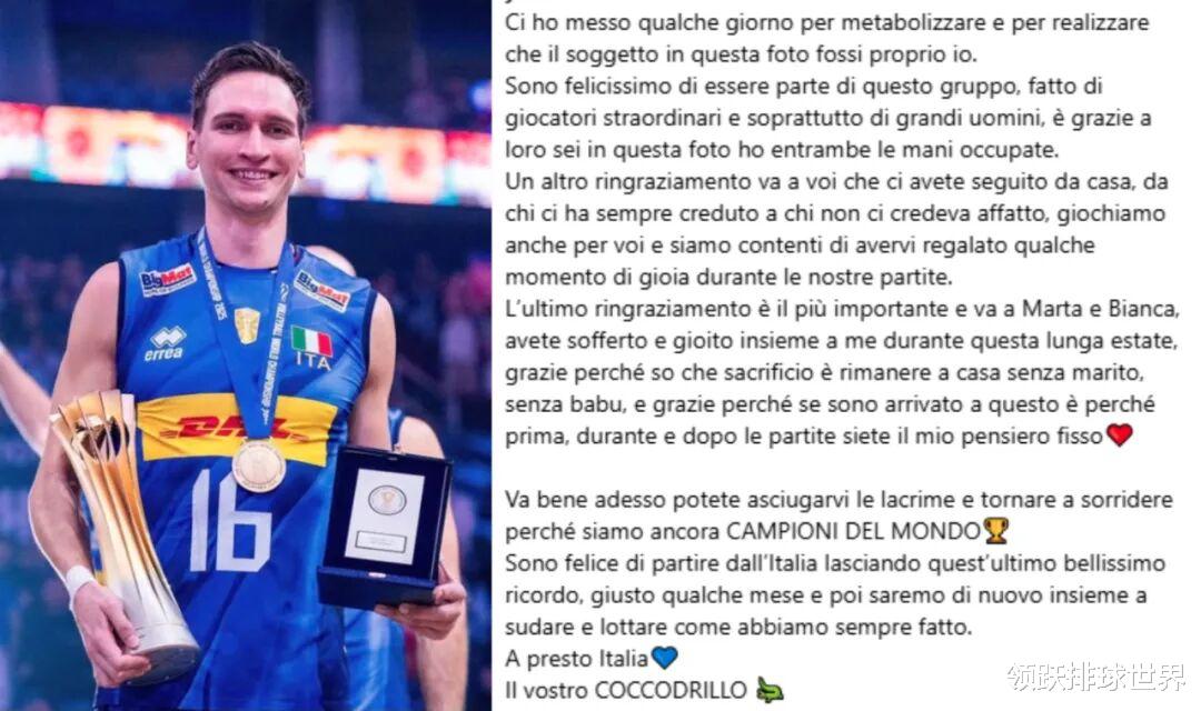 “好了现在可以擦干眼泪,重新露出笑容,因为我们依然是世界冠军,能在离开意大利前留下这样美好的回忆,我感到非常幸运,再过几个月,我们又会像往常一样,一起挥汗、一起拼搏,再见了,意大利,你们的鳄鱼。”
