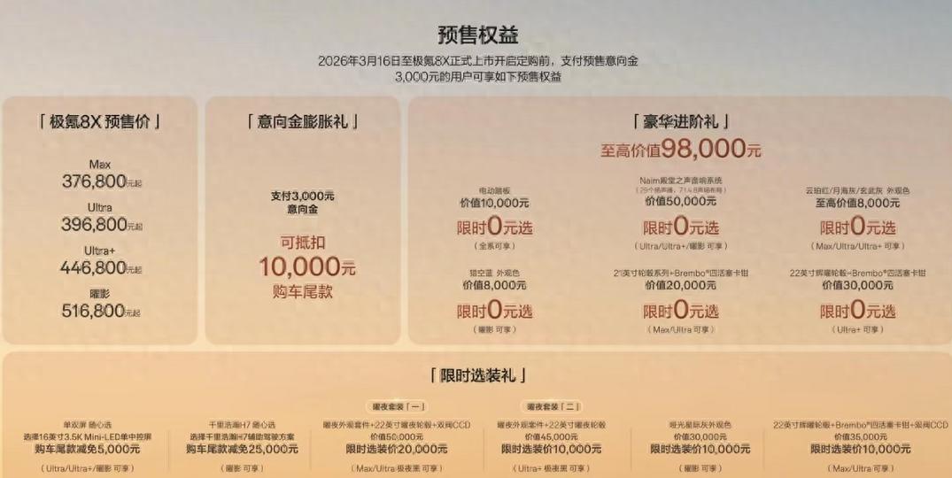 极氪为首批预订用户准备了三重重磅购车礼,即日起至正式上市前,支付3000元意向金可抵扣10000元购车尾款,还能享受至高价值9.8万元的豪华进阶礼,包含29扬声器Naim殿堂之声音响、电动踏板等配置限时0元选,同时还有6项限时选装礼加持,进一步降低用户的高端配置入手门槛,兼顾了性能与家庭使用的多元需求。