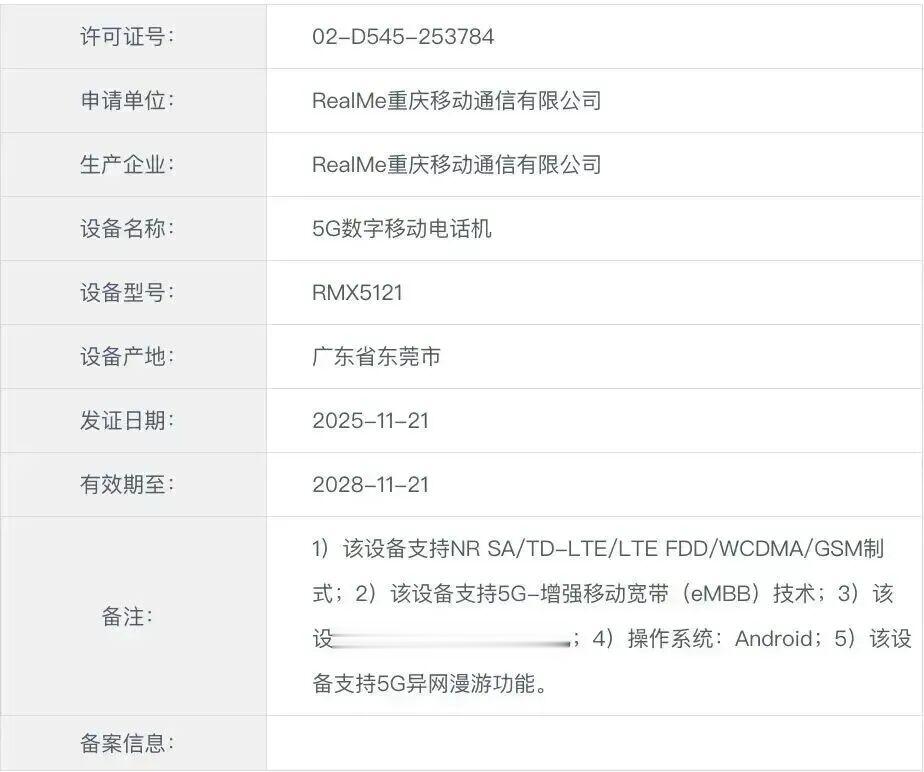 除了定制版新品外,最近的消息还显示,一款型号为RMX5121的真我旗下新机通过了认证。其中没有详细的产品系列信息,但有推测认为其有可能是真我 16 Pro。