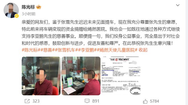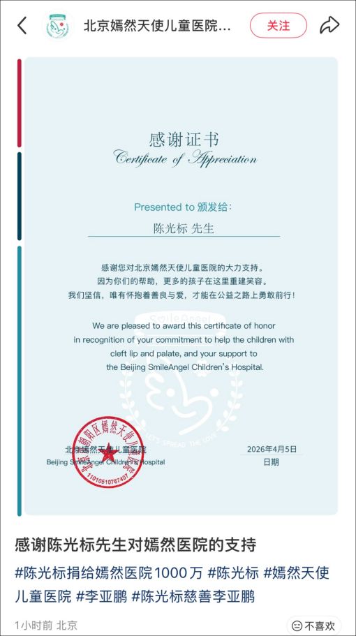 结果车没提,人也没见面,陈光标直接将车变现,1000万主动捐给了李亚鹏的北京嫣然天使医院。4月7号,嫣然医院也特意发了感谢证书,感谢陈光标帮助孩子们。