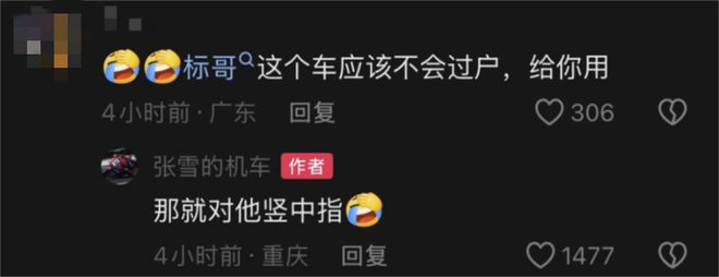 网友又说:这车应该不会过户,你最多有个使用权。张雪说:那就给他竖中指。