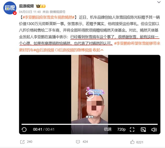 只是没想到,车还没收到,张雪反手就把车捐了。他打算找个二手车商把车卖了,钱全部捐给嫣然天使基金。