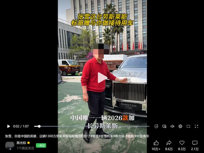 4月1号愚人节那天,慈善家陈光标高调宣布:要送张雪一辆劳斯莱斯幻影,中国唯一一辆2026款加长版,市场价1300万。